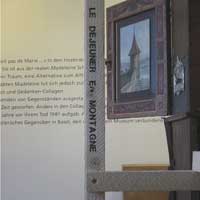 Das Gestell für die Objekte ist aus rohen Dachlatten gefertigt. Die Titel der Arbeiten sind direkt auf die Latten gestempelt. Einige Arbeiten sind mit Blenden versehen bei denen man durch Gucklöcher ausgewählte Bereiche betrachten kann. Der Besucher muss sich so um den Einblick in die üppig gestalteten Szenen bemühen und sich in sie hineindenken.