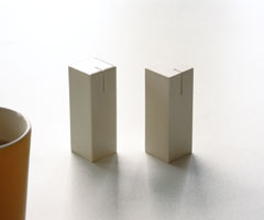 Dieser sitzt mittig, zu einem Teil in der Oberseite, zu zwei Teilen in der Seitenwand. Die Unterscheidung zwischen Salz- und Pfefferstreuer wird nicht klassisch über die Art der Öffnung, sondern subtiler über die Oberfläche gelöst. Beide Streuer sind in Prozellan gefertigt, Salz ist glasiert, Pfeffer unglasiert. So erscheint das Pärchen auf den ersten Blick gleich, erst durch die Spiegelung im Licht und die Haptik erfolg assoziativ die Zuordnung.